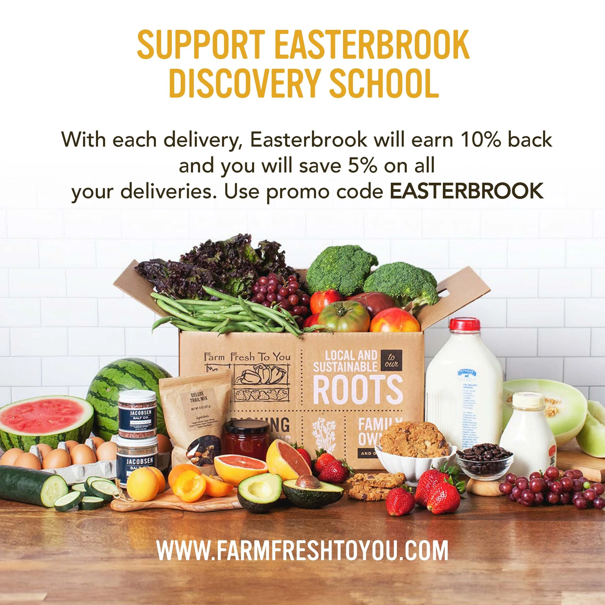 Farm Fresh To You makes it easy to eat organically grown produce by offering several different box types and sizes delivered directly to you. With each delivery, Easterbrook will earn 10% back and you will save 5% on all your deliveries. Use promo code EASTERBROOK